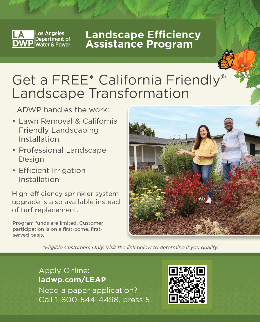 LADWP is excited to share with you our new program, the Landscape Efficiency Assistance Program (LEAP) which provides single family residential customers in disadvantaged communities (DAC) FREE turf removal, installation of new California Friendly Gardens, and/or high-efficiency irrigation upgrades. The goals of LEAP are to encourage sustainable landscape practices, promote water conservation, and provide water savings that will help alleviate financial burdens on residents in DACs.