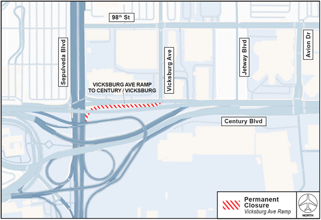 Oct. 30, 2025 — To facilitate construction activities for the ATMP Roadways Project, the Vicksburg Avenue ramp from northbound Sepulveda Boulevard to Century Boulevard / Vicksburg Avenue will permanently close effective Friday, November 7 at 10 p.m. As construction continues near this area, please watch for posted signage and be aware of new roadway configurations and traffic patterns. Use caution when traveling near construction areas and plan ahead for potential delays.